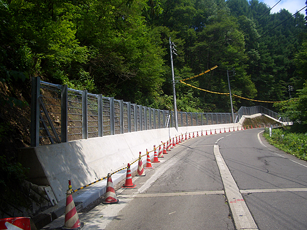2013年07月長野県中野市大字永江(市道斑山線)で積雪地用ロックフェンスを設置しました。仕様・構造 RF-7-SNJ 柵高2.0m、延長96m