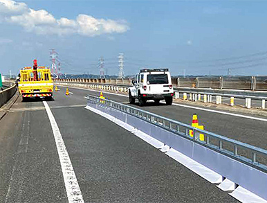 - 事故等により車線がふさがれた場合、ワイヤロープを緩めて中間支柱を取り外し、片側交互通行にすることで交通を確保することができます。